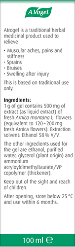 Atrogel® Arnica gel is a traditional herbal medicinal product used for the symptomatic relief of muscular aches, pains and stiffness, sprains and bruising, exclusively based upon long-standing use as a traditional remedy. Always read the leaflet